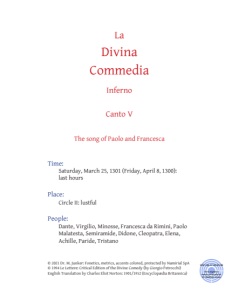 La Divina Commedia Inferno Canto V The song of Paolo and Francesca Time: Saturday, March 25, 1301 (Friday, April 8, 1300): last hours Place: Circle II: lustful People: Dante, Virgilio, Minosse, Francesca da Rimini, Paolo Malatesta, Semiramide, Didone, Cleopatra, Elena, Achille, Paride, Tristano © 2021 Dr. M. Junker: Fonetics, metrics, accents colored, protected by Namirial SpA © 1994 Le Lettere: Critical Edition of the Divine Comedy (by Giorgio Petrocchi) English Translation by Charles Eliot Norton: 1901/1952 (Encyclopædia Britannica)