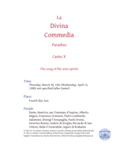 La Divina Commedia Paradiso Canto X The song of the wise spirits Time: Thursday, March 30, 1301 (Wednesday, April 13, 1300): not specified (after Easter) Place: Fourth Sky: Sun People: Dante, Beatrice, san Tommaso d’Aquino, Alberto Magno, Francesco Graziano, Pietro Lombardo, Salomone, Dionigi l’Areopagita, Paolo Orosio, Severino Boezio, Isidoro di Siviglia, Riccardo di San Vittore, Beda il Venerabile, Sigieri di Brabante © 2021 Dr. M. Junker: Fonetics, metrics, accents colored, protected by Namirial SpA © 1994 Le Lettere: Critical Edition of the Divine Comedy (by Giorgio Petrocchi) English Translation by Charles Eliot Norton: 1902/1952 (Encyclopædia Britannica)